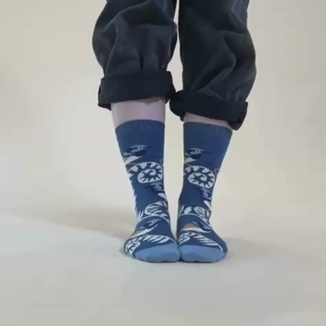 Stand out with the pretty blue Australian fairy wren hoping around on your sock! With a denim marle background and a curling fern leaf design, this masterpiece is crafted by local artist Eloise Short, only for The Sockery!