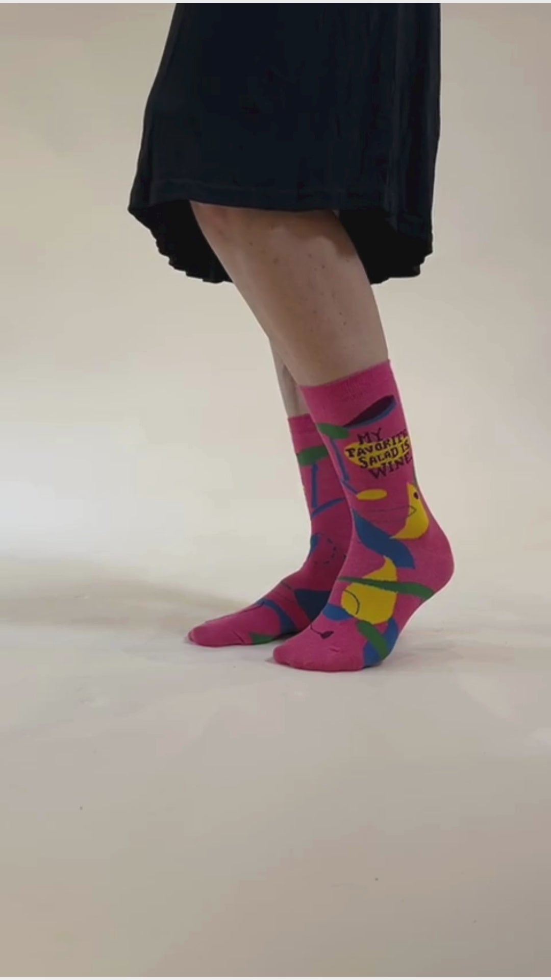 Pink Women's Crew socks with 'My Favorite Salad is Wine'. Fruit salad, that is.