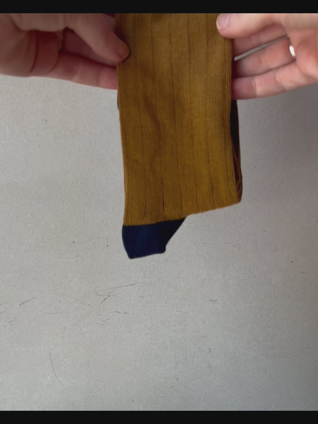 The body of the sock is a rich mustard colour with a thin navy stripe between the ribbing and on the heel, toe and cuff.