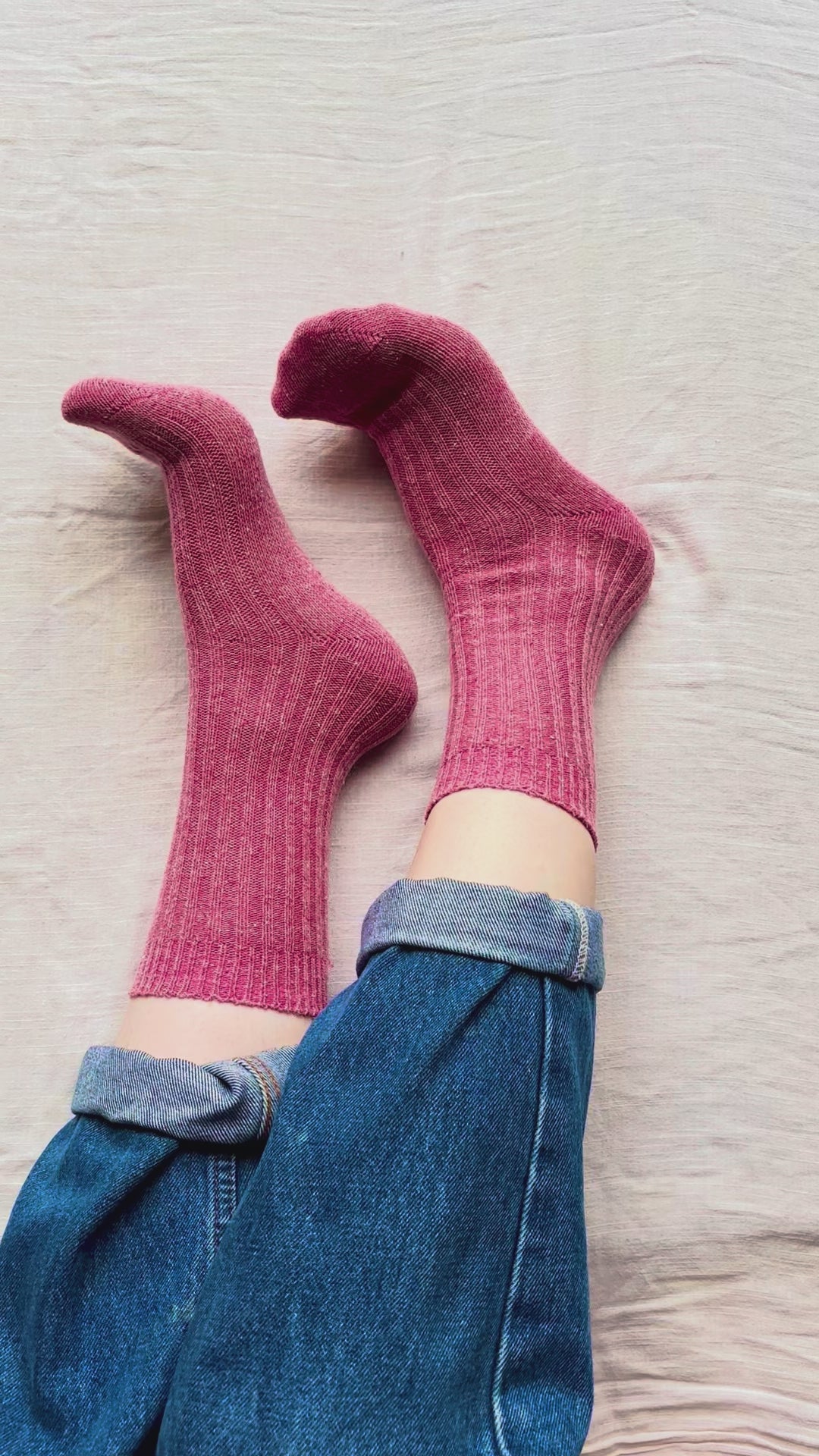 Compostable PackagingIntroducing the next level of comfort and sophistication: These rose coloured silk and wool blend socks, designed to elevate your sock game to unmatched levels of luxury and comfort. A rose pink sock with tiny white speckles.