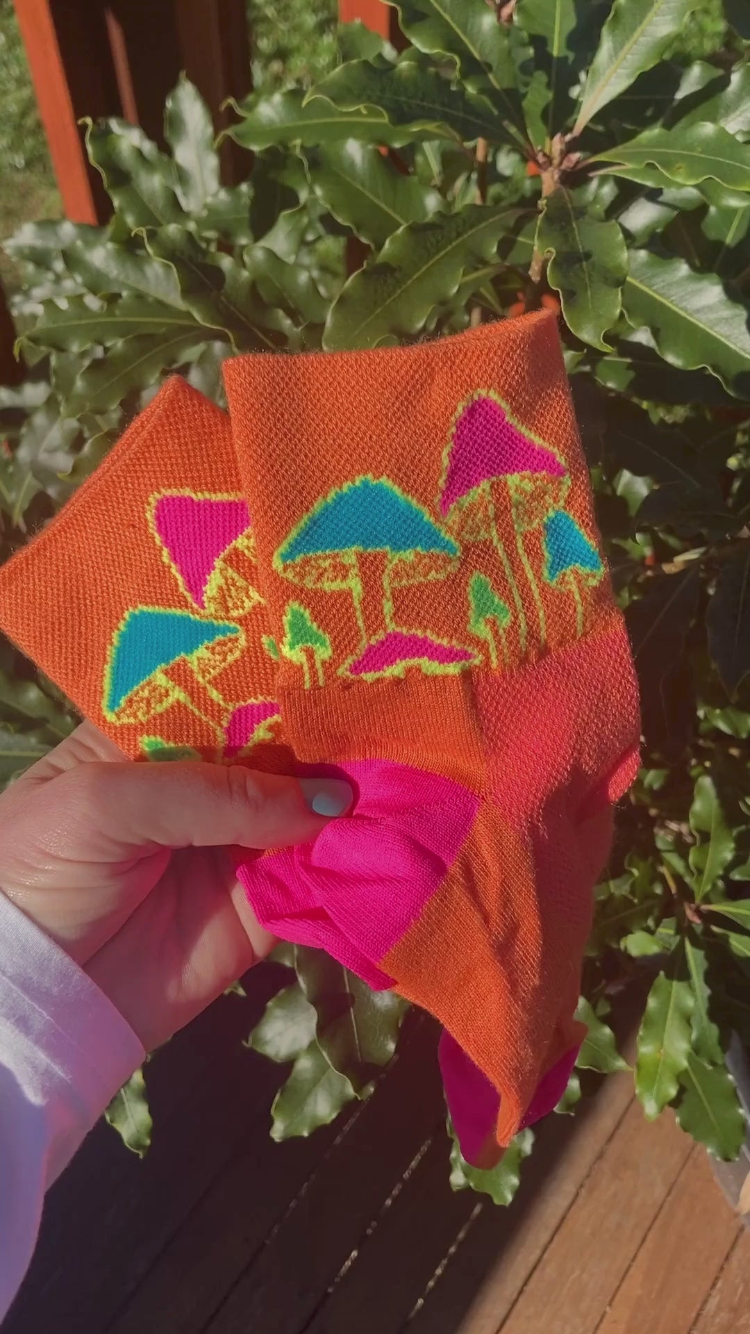 Fluorescent mushrooms on a bright orange sock. See video for truest representation of neon colours!